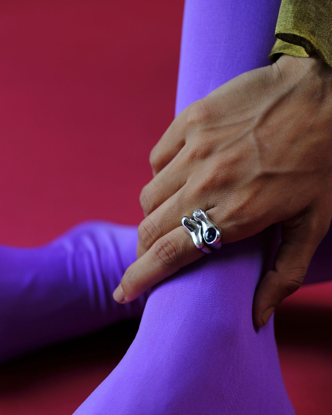 The Divide is a sculptural double band that holds space, not just between its layers, but for every version of you. Featuring a contrast of crystals set apart yet bound by a single form, it represents power in duality: stillness and fire, softness and edge, instinct and intention